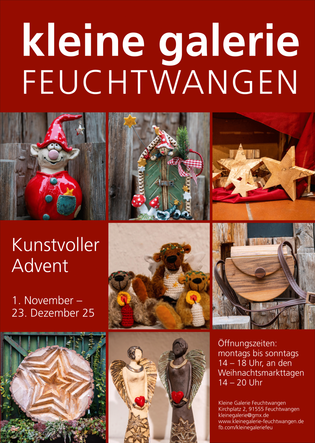 Von 1.11. bis 23.12. findet die Weihnachtsausstellung unter dem Motto “Weihnachtszauber” in der Kleinen Galerie Feuchtwangen statt. Die Öffnungszeiten sind wie gewohnt von 14 bis 18 Uhr. An Weihnachtsmarkttagen bis 20 Uhr. Finden Sie mehr zu unseren Ausstellungen bei Unseren Ausstellungen